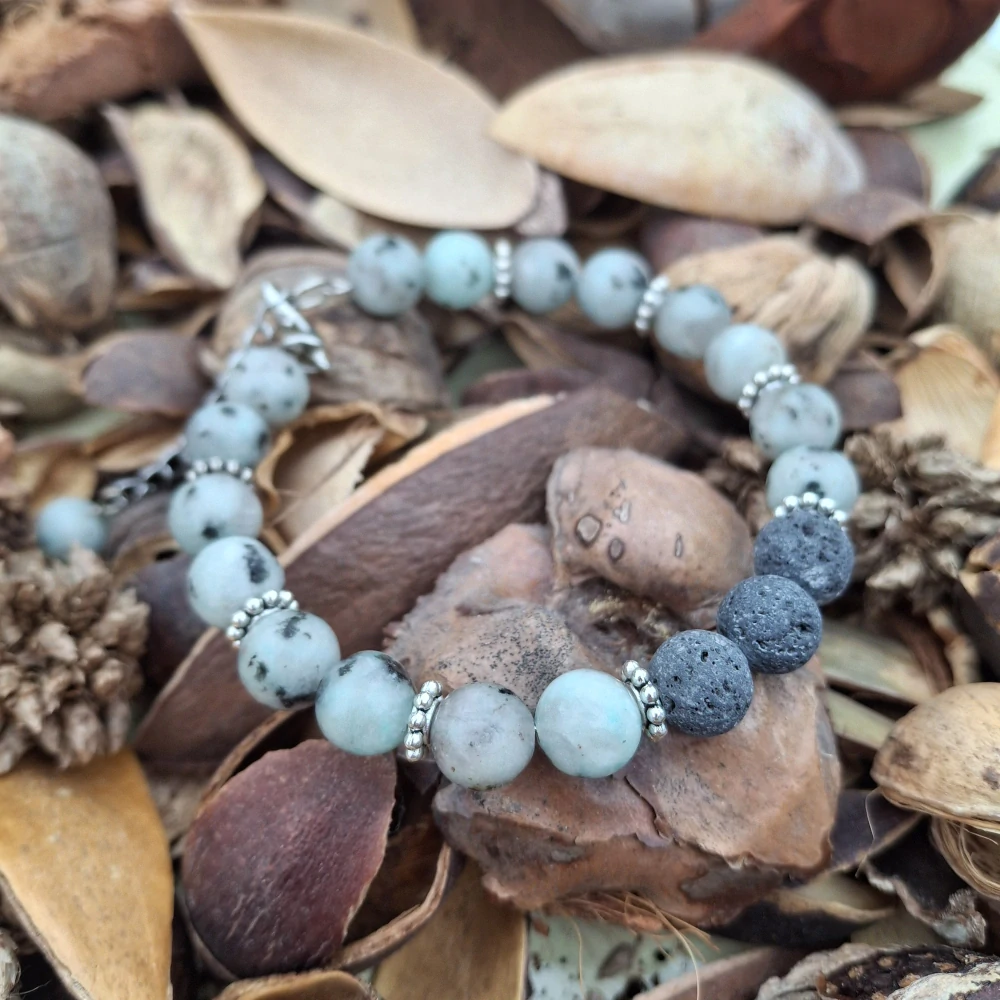 Náramek z přírodního kamene sezamový jaspis, surové lávy a kovových mezikroužků.