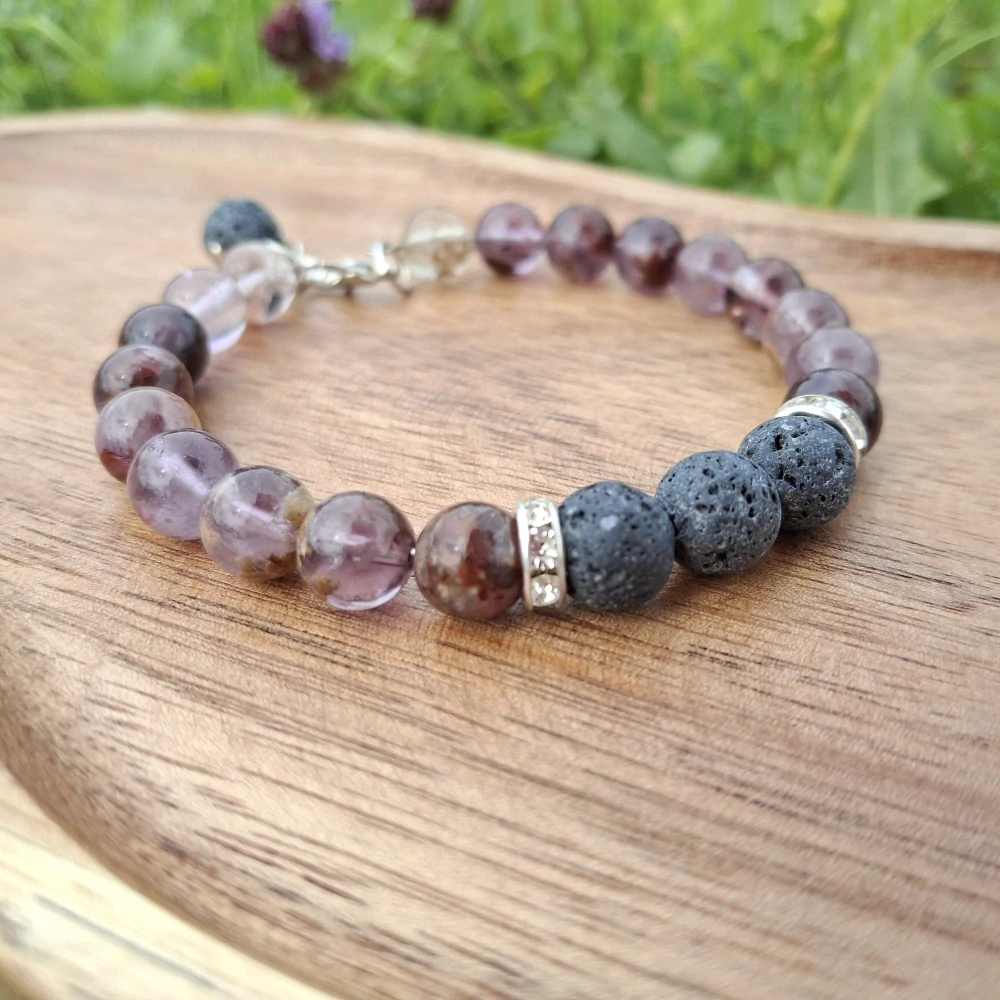 Náramek z přírodního kamene fialový lodolitový křemen, surové lávy a rondelek.