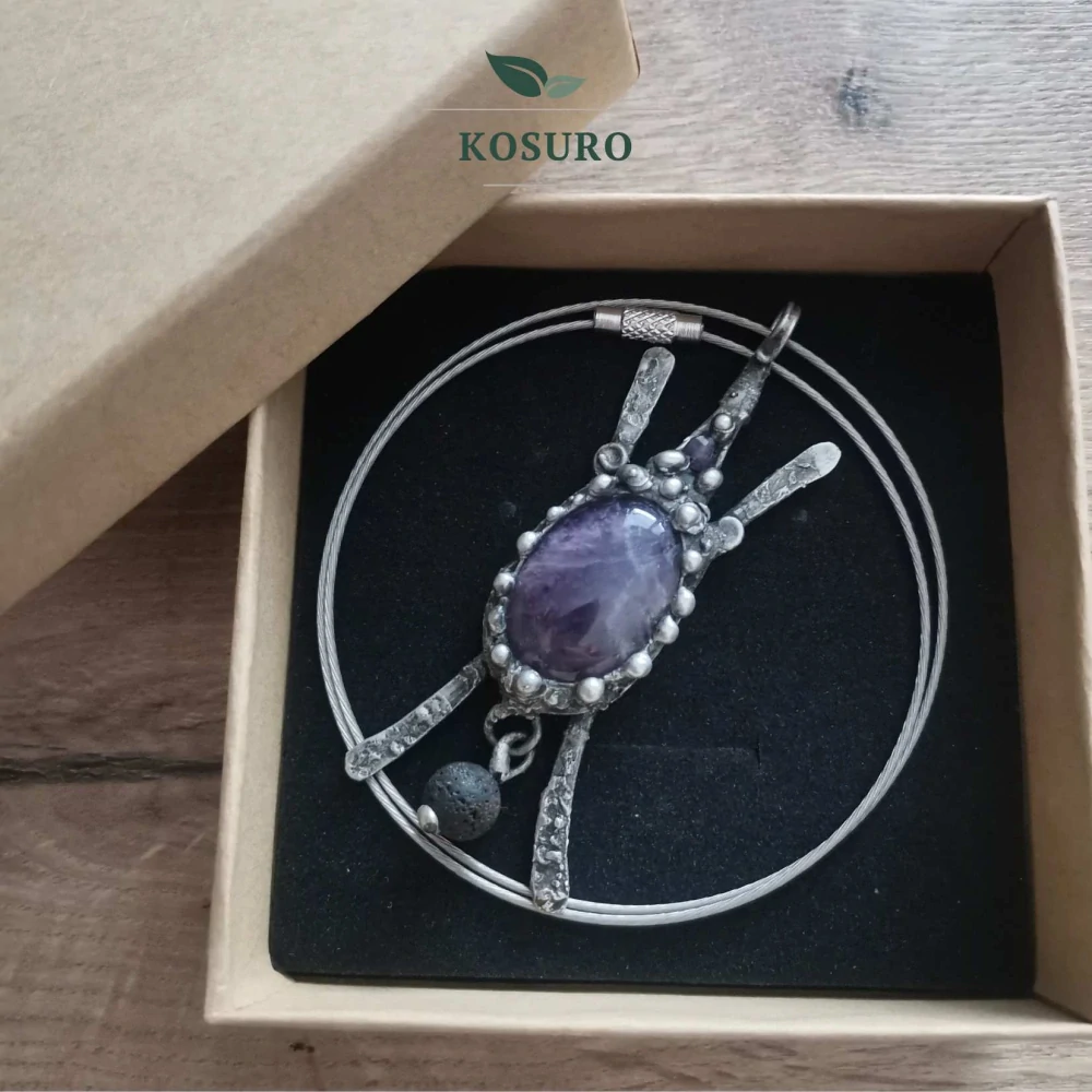 Náhrdelník s přívěškem z achátu a korálkem ze surové lávy.. Přívěšek je vyhotoven metodou cínování bezolovnatým cínem. Lávový korálek je schopen "natáhnout" éterické oleje a je vhodný pro jemnou aromapéči. Stačí 1 kapka EO nebo směsi EO. Vivem tělesného tepla se pozvolna odpařuje a působí na psychiku i fyzické zdraví dle zvoleného výběru EO.