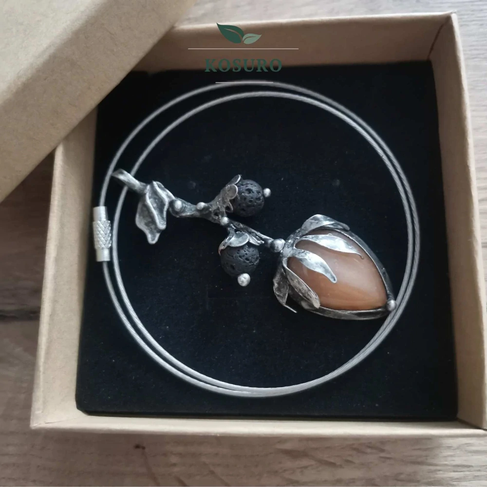 Náhrdelník s přívěškem z červeného aventurínu a korálků ze surové lávy. Přívěšek je vyhotoven metodou cínování bezolovnatým cínem. Lávový korálek je schopen "natáhnout" éterické oleje a je vhodný pro jemnou aromapéči. Stačí 1 kapka EO nebo směsi EO. Vivem tělesného tepla se pozvolna odpařuje a působí na psychiku i fyzické zdraví dle zvoleného výběru EO.