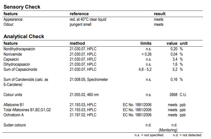 Extrakt obsahuje 5,2 % kapsaicinoidů: nordihydrokapsaicin, kapsaicin, dihydrokapsaicin a 0,16 % karotenoidů