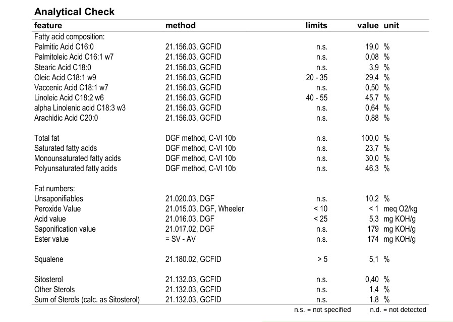 Fyzikální vlastnosti: žlutá olejovitá kapalina rozpustná v tucích, snadno dispergovatelná v alkoholu, ideálně přidávat ke konci emulgování