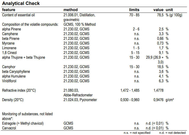 Fyzikální vlastnosti: Jemně žlutá kapalina rozpustná v tucích s typickou vůní šalvěje.