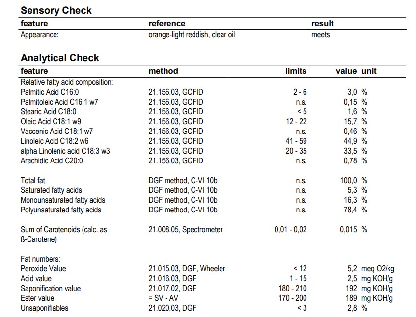Fyzkální vlastnosti: žlutočervená čirá olejovitá kapalina rozpustná v tucích a alkoholu, hustota 0,92 g/cm3, ideálně přidávat ke konci emulgování
